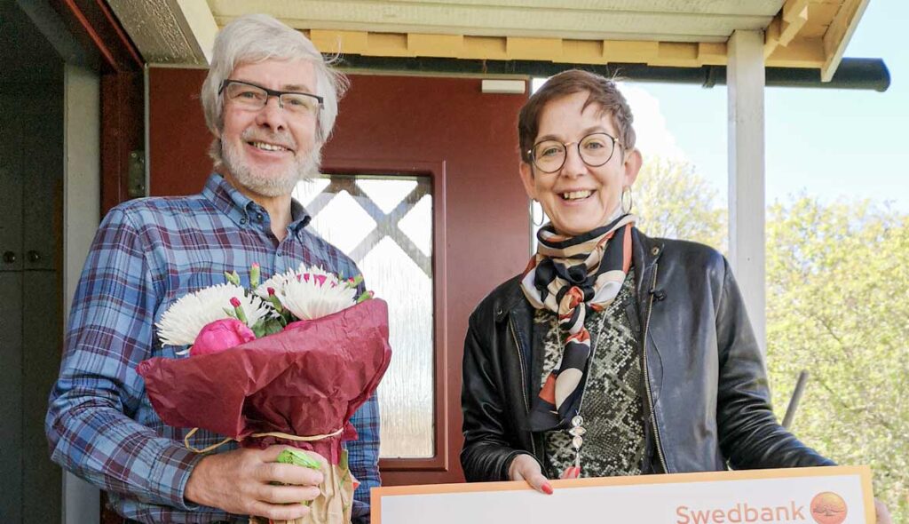EFS missionsföreståndare Kerstin Oderhem delade ut priset i form av blommor, diplom och en check på 10 000 kronor till en förvånad och överraskad Martin Nilsson i Gamla Uppsala. Bild: Victor Forssman Du kanske också vill läsa:Kajsa Lindståhl, VD för Banco, överlämnar diplom…Salts projektkoordinator Victor Forssman lyfter…Britt-Marie Rosén avtackades av EFS…Kerstin Oderhem delade öppenhjärtligt om sin…