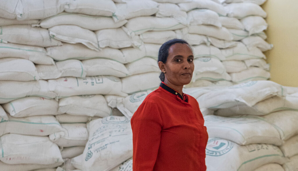 Enligt FN lider 80 procent av befolkningen i Tigray matbrist. Tack vare bistånd från EFS har Mekane Yesus biståndsorgan DASSC kunnat dela ut bland annat vete och olja till interna flyktingläger i regionhuvudstaden Mekelle. Här står DASSC:s medarbetare framför säckar med vete som förvaras på huvudkontoret. Bild: Dagmawit Alemayehu