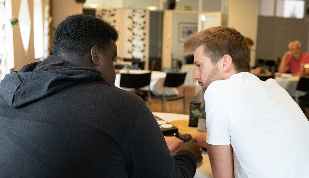 Jonathan pratar mycket om »gatans förväntningar« och »mammas förväntningar«. Vill man ha poäng i Neghbourhood ska man sitta med sina läxor, inte titta på mobilen. Med tiden börjar ungdomarna identifiera sig mer med »mammas förväntningar«. Bild: Lucas Mellergård