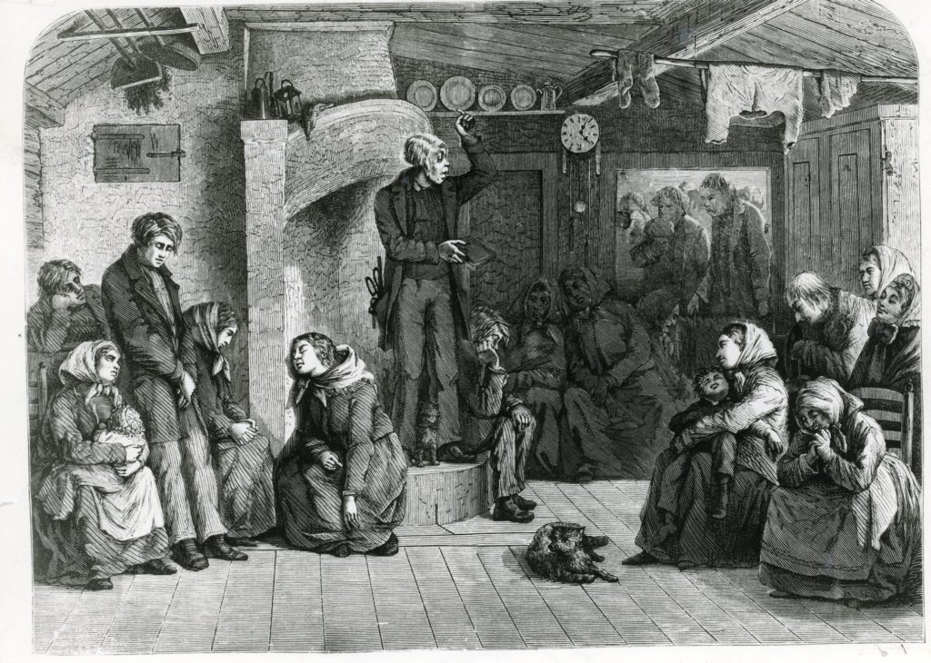 Nästa bild En kolportör i en småländsk stuga. Tecknat efter naturen av K A Ekvall. Ny illustrerad tidning 1870. Så kan det ha gått till när hattmakaren Engzell predikade i Småland sommaren 1856. Bild: EFS arkiv Du kanske också vill läsa:En kolportör håller predikan i ett småländskt hem.…Figeholms lutherska bönhus, byggt 1868. Fick 1870…Frans (1870–1961) och Clara (1868–1894), här på äldre dagar.Missionsmöte vid missionsinstitutet Johannelund i…
