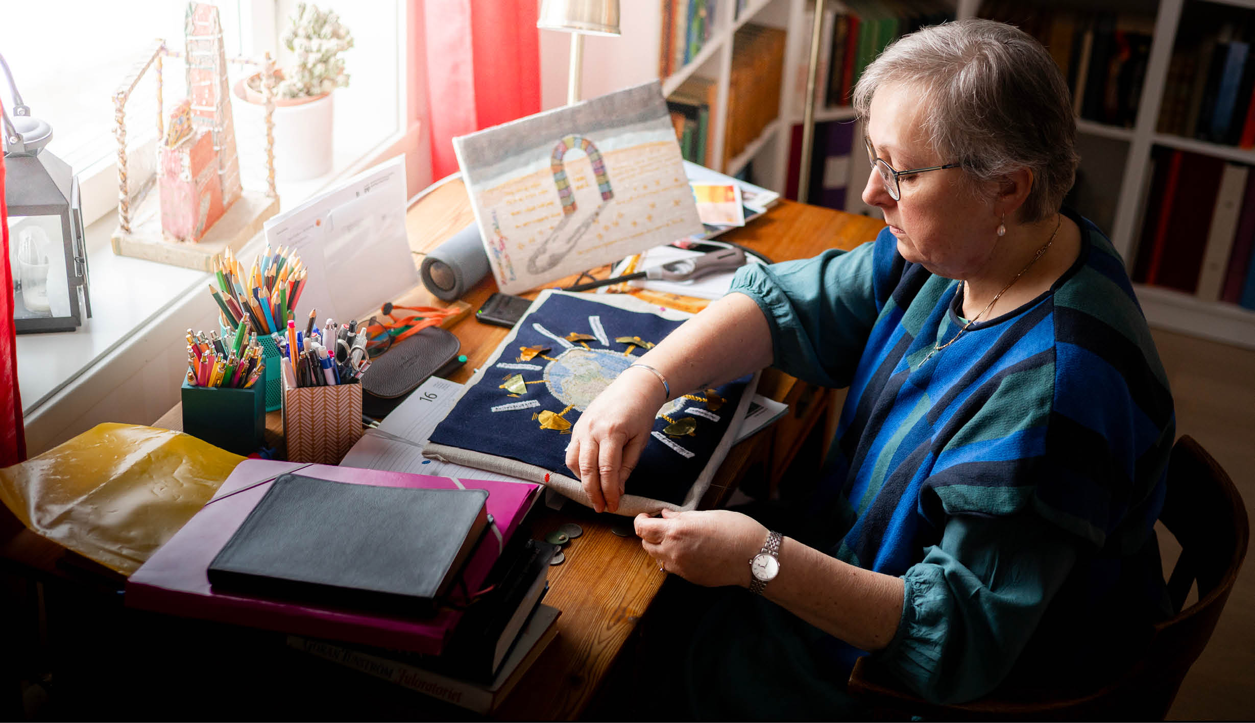 Föregående bildNästa bild – Jag har inget förstånd att tänka på hur stort det är – andra gör kanske något litet bokmärke, säger Erika. Du kanske också vill läsa:Erika har gått några korta helgkurser, men är…Erik Johansson fyller 50 år den 23 februari. Det…– Kanske att vi som kyrka ska försöka möta människor…– Hantverk anses ju vara en nådegåva – då kanske jag…