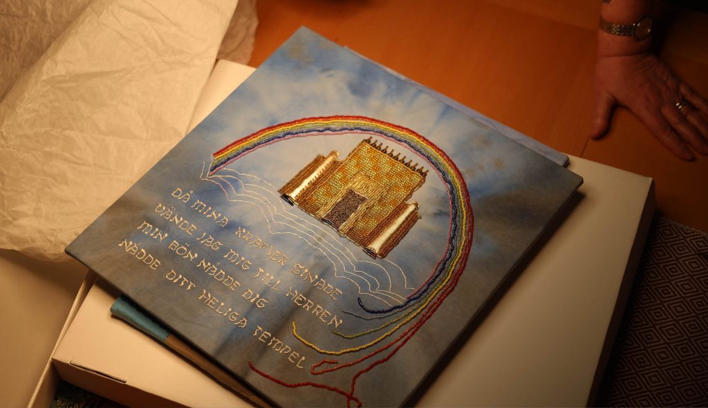 Föregående bildNästa bild Jona 2:8 broderade Erika på ett batikfärgat tyg, med Salomos tempel och en regnbåge i pärlor. Texten tog tre veckor att sy, medan pärlbroderiet tog tre dagar. Du kanske också vill läsa:Vid sitt köksbord visar Erika Cyrillus Budbärarens…Erika har gått några korta helgkurser, men är…När Bibeln på ellomwe släpptes var glädjen stor.…David Åhlén Ålder: 40 Bor: Stenkumla, Gotland,…
